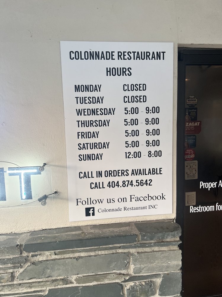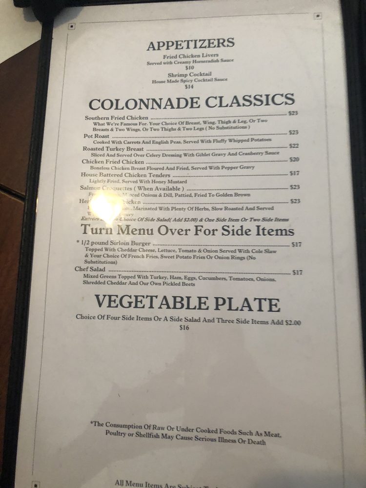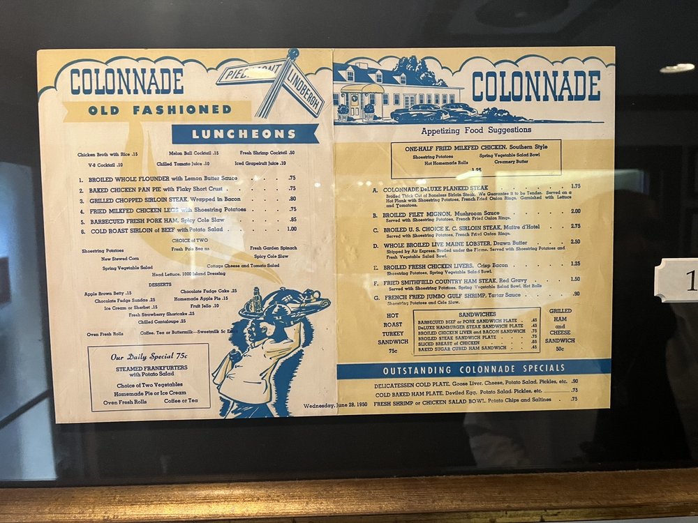 Introducing the menu at Colonnade, a Southern-American restaurant located in Atlanta, GA, known for its midcentury modern charm and excellent food. The menu features options like the best fried chicken in Atlanta, a retro wedge of lettuce salad, and delicious yeast rolls and cornbread mini muffins. Noteworthy dishes include the veggie plate, chicken tender salad, and chef salad, all prepared with fresh ingredients and served with care. Customers rave about the friendly staff, cozy atmosphere, and exceptional cocktails made by the talented bartenders. With a focus on classic Southern fare and a warm, welcoming ambiance, Colonnade provides a dining experience that feels both special and familiar. Don't miss out on the chance to savor the flavors of the South at this beloved Atlanta tradition.